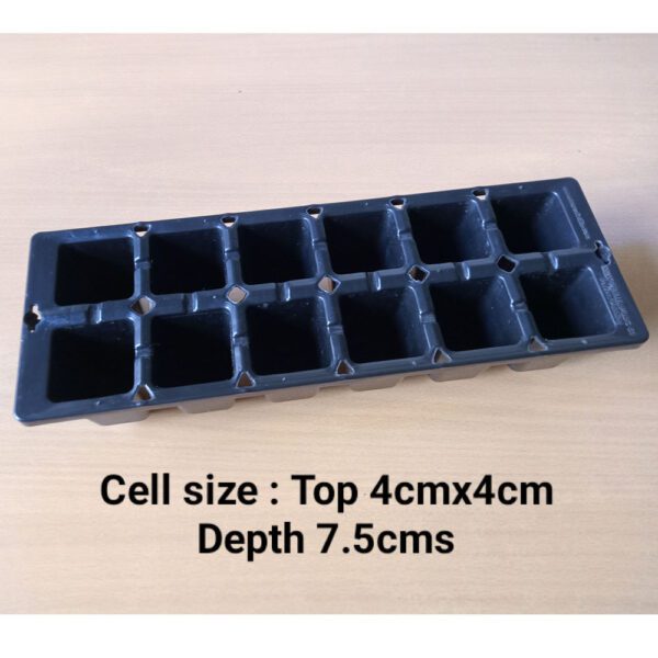 Seedling Trays - 12 Cells (Reusable) Tray Dimensions - Length 12 inches, Width 3 inches, Height 3 inches Cell Dimensions - Length 4 cm x Width 4 cm x Height 7.5 cm